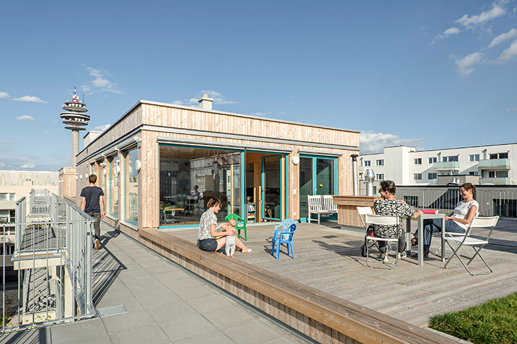 Das Dachgeschoß mit Gemeinschaftsflächen wie Spielraum, Küche, Bibliothek und Sauna im Inneren und großzügigen Freiflächen im Äußeren.