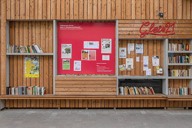 Der Sockel des Gebäudes versteht sich als Kommunikator: Schon beim Wettbewerb war die Nutzung der Erdgeschoßzone inhaltlich für die Bewohner des Grätzels und darüber hinaus vorgesehen. So konzipierte die Gruppe drei Säulen für die Umgebung: Die Nachbarschaftswand mit interaktivem Buchtauschregal und schwarzem Brett, den multifunktionalen Saal, der einerseits Veranstaltungen Raum gibt und andererseits mietbar ist. Last but not least das Künstleratelier ToZomia samt angeschlossenem Café Kaffeesatz.
