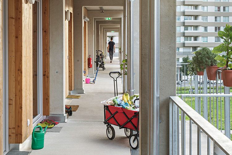 Die privaten Balkone auf der eine und der gemeinschaftliche Laubengang auf der anderen Seite.