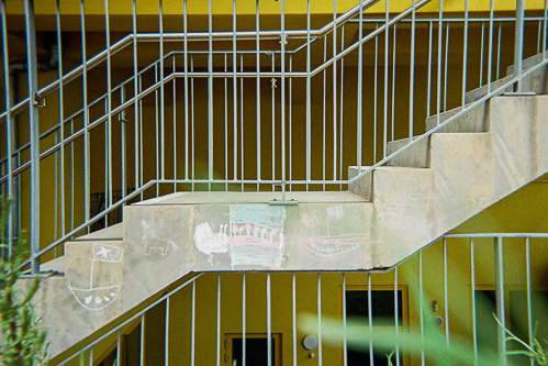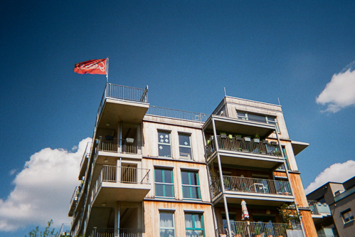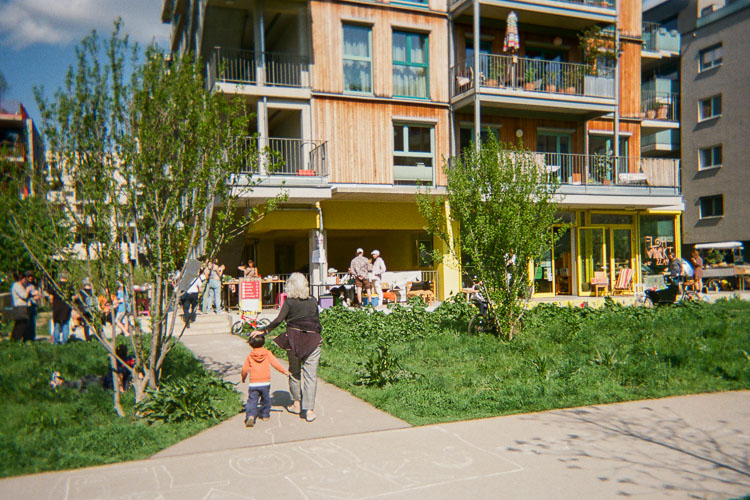 My suitcase was half clothes − half books on collective living. My laptop was ready for a daily journal recording interviews and reflections. My analog cameras quickly started to travel among my new neighbors − and I followed. I joined them for dinners and breakfasts, got a few house tours and many background insights, we talked in people’s living rooms or the shared sauna, I came to the short movie festival, watched a few working groups’ meetings, and joined the flea market by the residing toZOMIA collective. Anything could reveal the patterns of life in a project like that. I would often eat lunch at the Stadtelefant next door, watch passersby stop at the Gleis 21 library, and process it all.